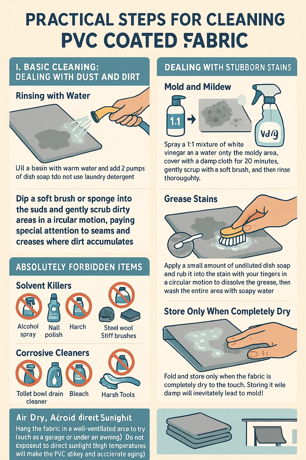 Phơi khô, tránh ánh nắng trực tiếp: Treo vải ở nơi thoáng gió để phơi khô (chẳng hạn như gara hoặc dưới mái hiên). Không để nó tiếp xúc trực tiếp với ánh nắng mặt trời (nhiệt độ cao sẽ làm cho PVC bị dính và đẩy nhanh quá trình lão hóa).