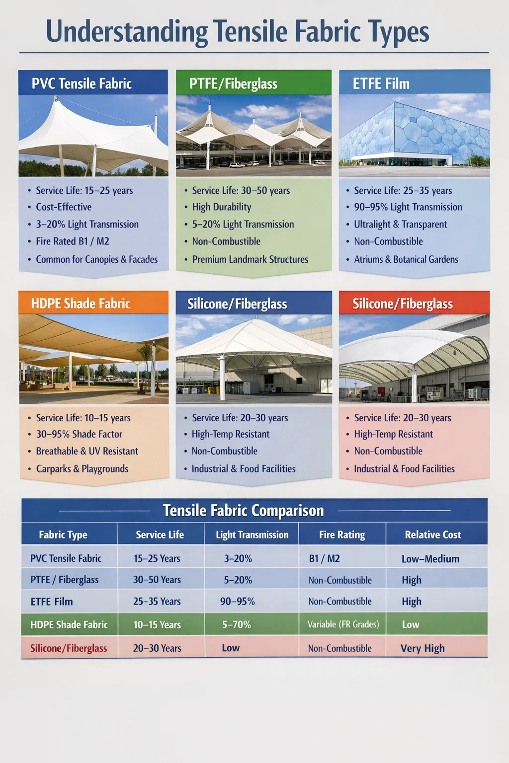 - Lớp 5–6 (750–1.100 g/m2): Đặc trưng của kiến trúc thương mại - mái che kéo, lối đi dành cho người đi bộ, nhà chờ trung chuyển và tấm ốp mặt tiền. Độ bền kéo 5.000–7.500 N/5 cm. Tuổi thọ sử dụng thường được đánh giá là 15–20 năm với lớp phủ ngoài PVDF.