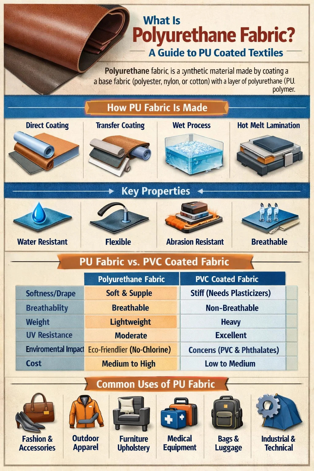 Vải polyurethane là một loại vật liệu dệt tổng hợp được làm bằng cách phủ hoặc cán một loại vải cơ bản - thường là polyester, nylon hoặc bông - với một lớp polymer polyurethane (PU). Kết quả là tạo ra một loại vật liệu có hình dáng và cảm giác tương tự như da hoặc cao su nhưng vẫn nhẹ, linh hoạt và giá cả phải chăng hơn nhiều so với các vật liệu thay thế tự nhiên. Nó được sử dụng rộng rãi trong thời trang, bọc ghế, đồ thể thao, thiết bị ngoài trời, thiết bị y tế và các ứng dụng công nghiệp.