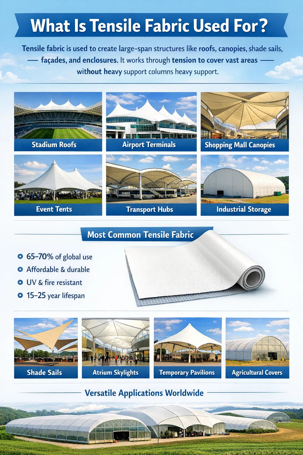 Ngoài các dự án kiến trúc uy tín, vải căng còn có tác dụng thực tế đáng kể trong bối cảnh công nghiệp và nông nghiệp - những lĩnh vực mà chi phí trên mỗi mét vuông và tốc độ lắp dựng quan trọng hơn nhiều so với tính thẩm mỹ.