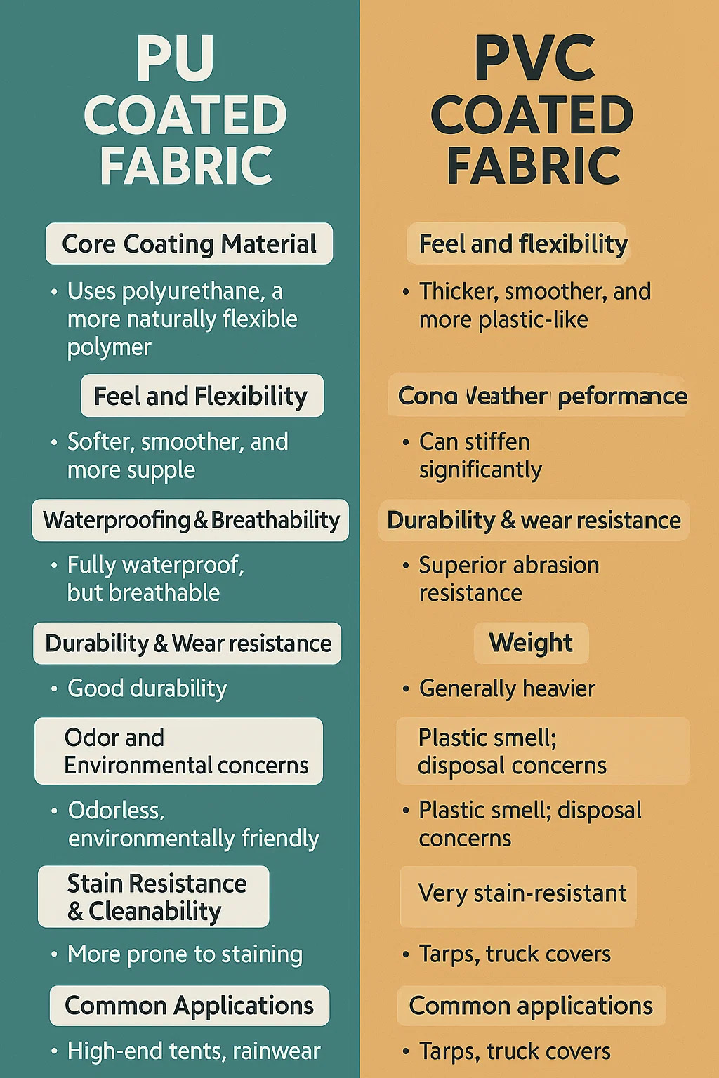 Sau đây là bảng phân tích những điểm khác biệt chính giữa vải phủ PU và vải Vải bọc PVC , dựa trên đặc điểm thực tế và ứng dụng: