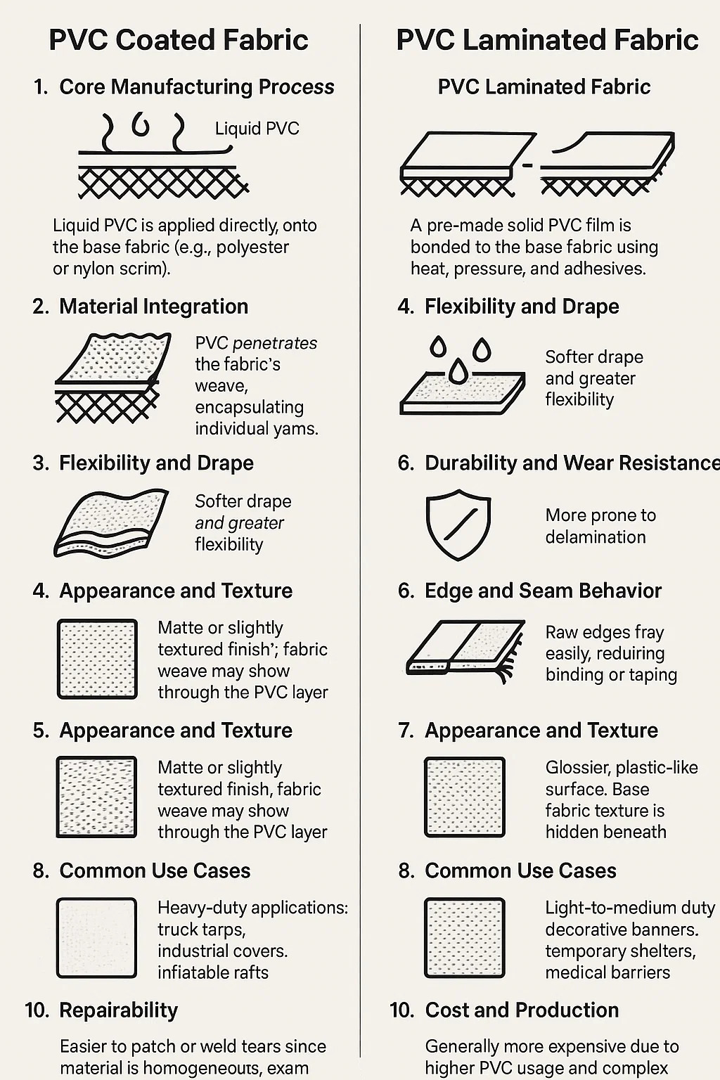 Nhiều lớp: Màng PVC nằm trên bề mặt vải mà không thấm sâu. Các lớp liên kết tại giao diện nhưng vẫn giữ các đặc tính riêng biệt.